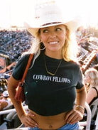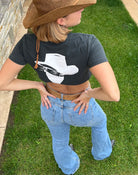 Add a little flair to your wardrobe with our Washed Black Cowboy Pillows®️ Tee. This black cropped tee features a playful white "wink" logo on the back, bringing a fun, flirty vibe to your casual style. Soft, stylish, and effortlessly cool, it’s the perfect top for showing off your free-spirited, cowboy-inspired personality!