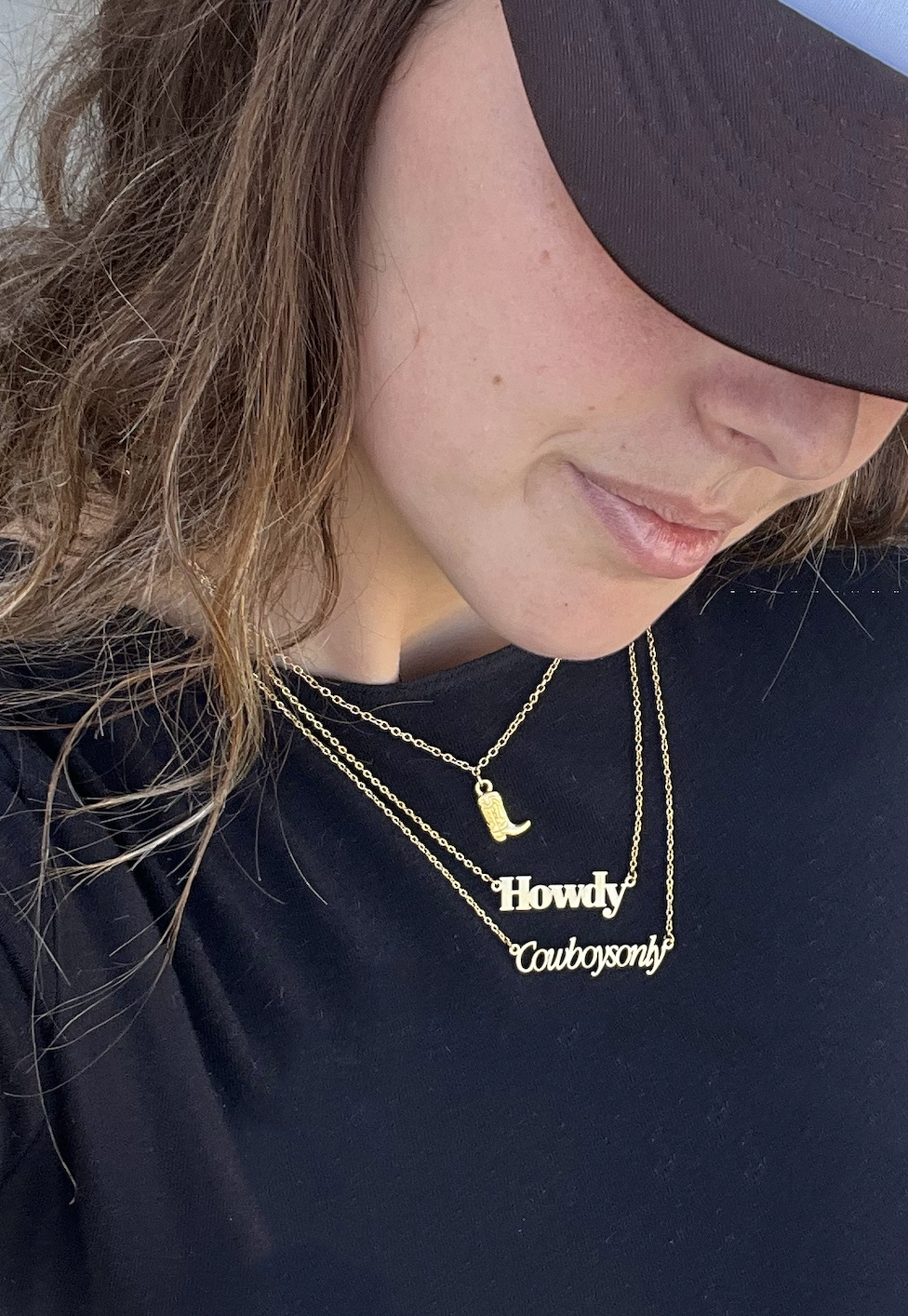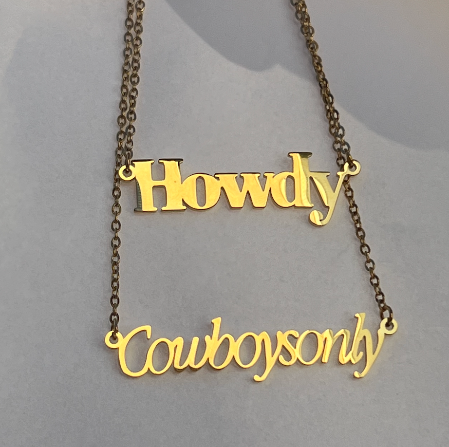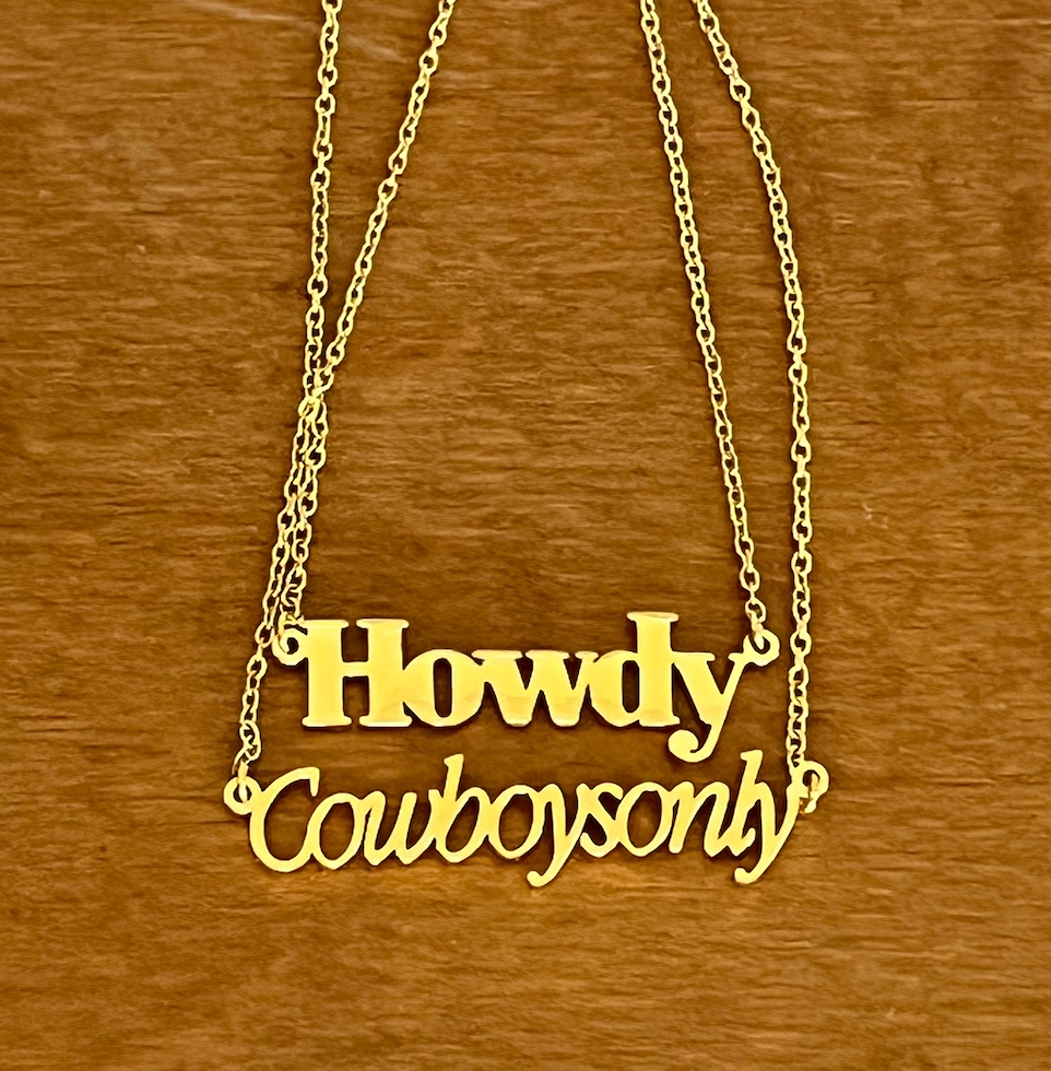 Add a touch of western elegance to your look with the Gold Howdy Necklace! This beautiful necklace features a sleek gold-plated stainless steel design that’s perfect for adding a little cowgirl charm to any outfit.