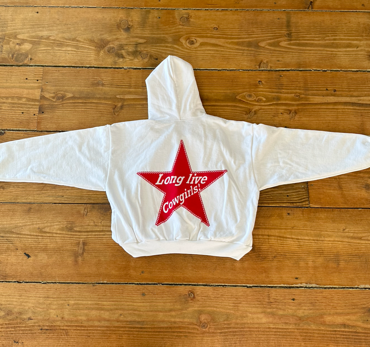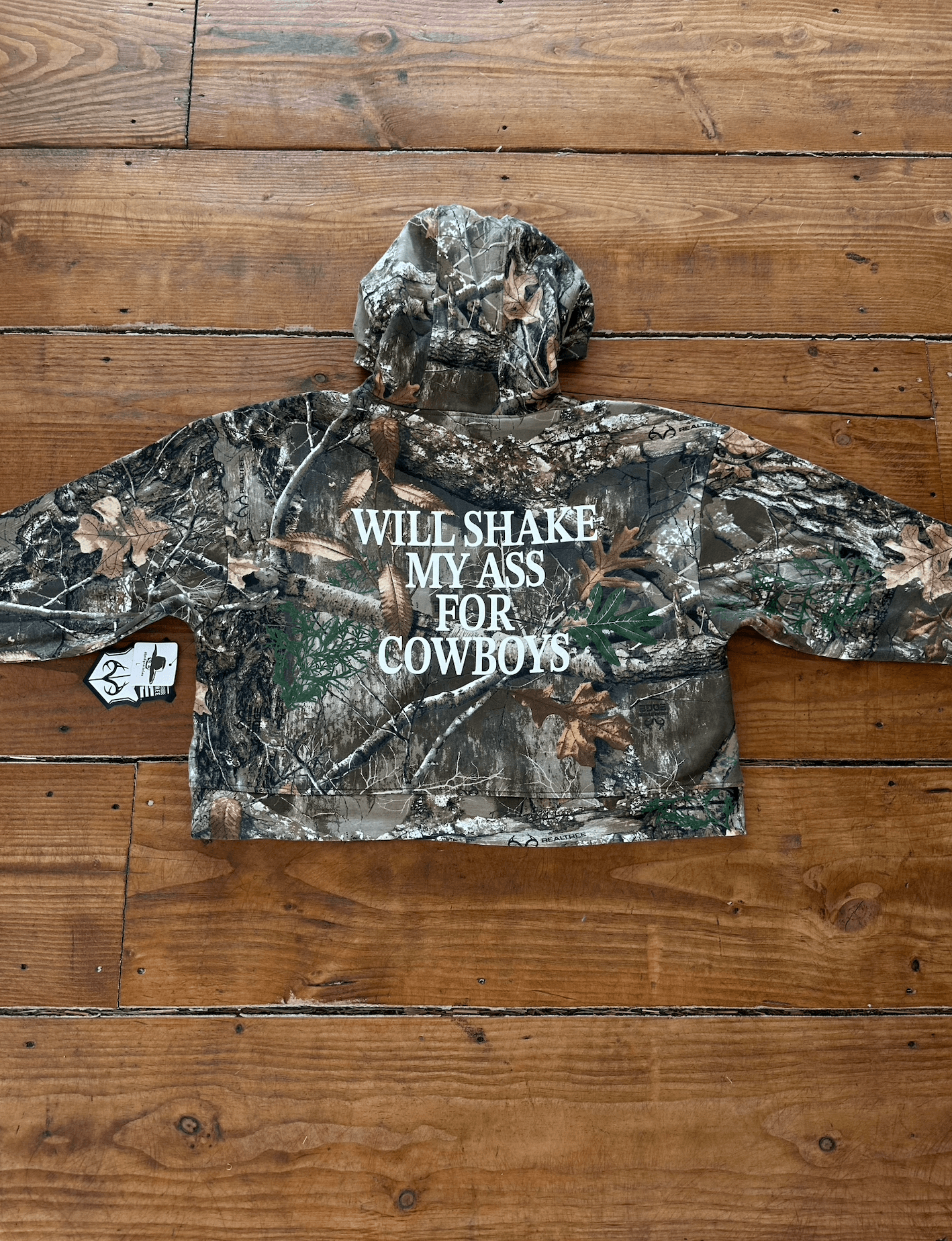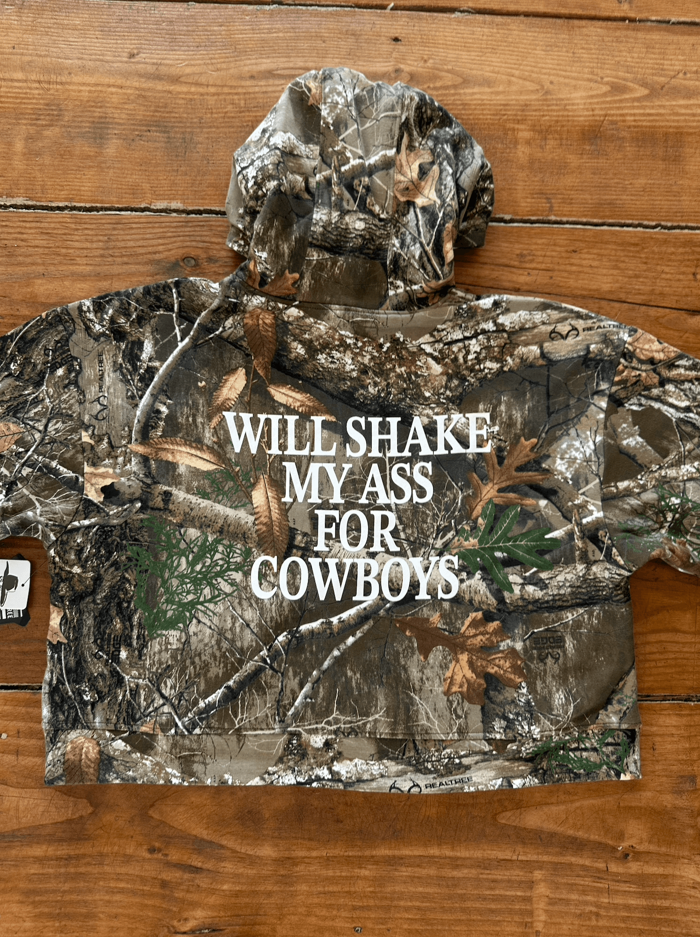 WHITE "Will Shake My Ass For Cowboys" Cropped Camo Hoodie
