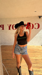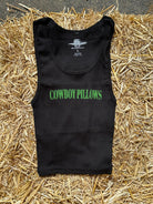 Show off your bold spirit with the Green Cowboy Pillows®️ Tank—a perfect blend of comfort, style, and that signature western flair. This cropped and ribbed black baby tank features striking green wording with the trademarked slogan that adds a pop of personality to any outfit.
