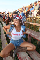 Yeehaw, Cowgirls! 🌵Get ready to rock the summer with the COWBOY PILLOWS®️ Tank! This "Concert" tank is a must-have for every cowgirl looking to turn heads and feel amazing. Handmade with love in the USA, this cropped, ribbed white baby tank features bold red wording and the trademarked COWBOY PILLOWS®️ slogan—perfect for showing off that western charm.