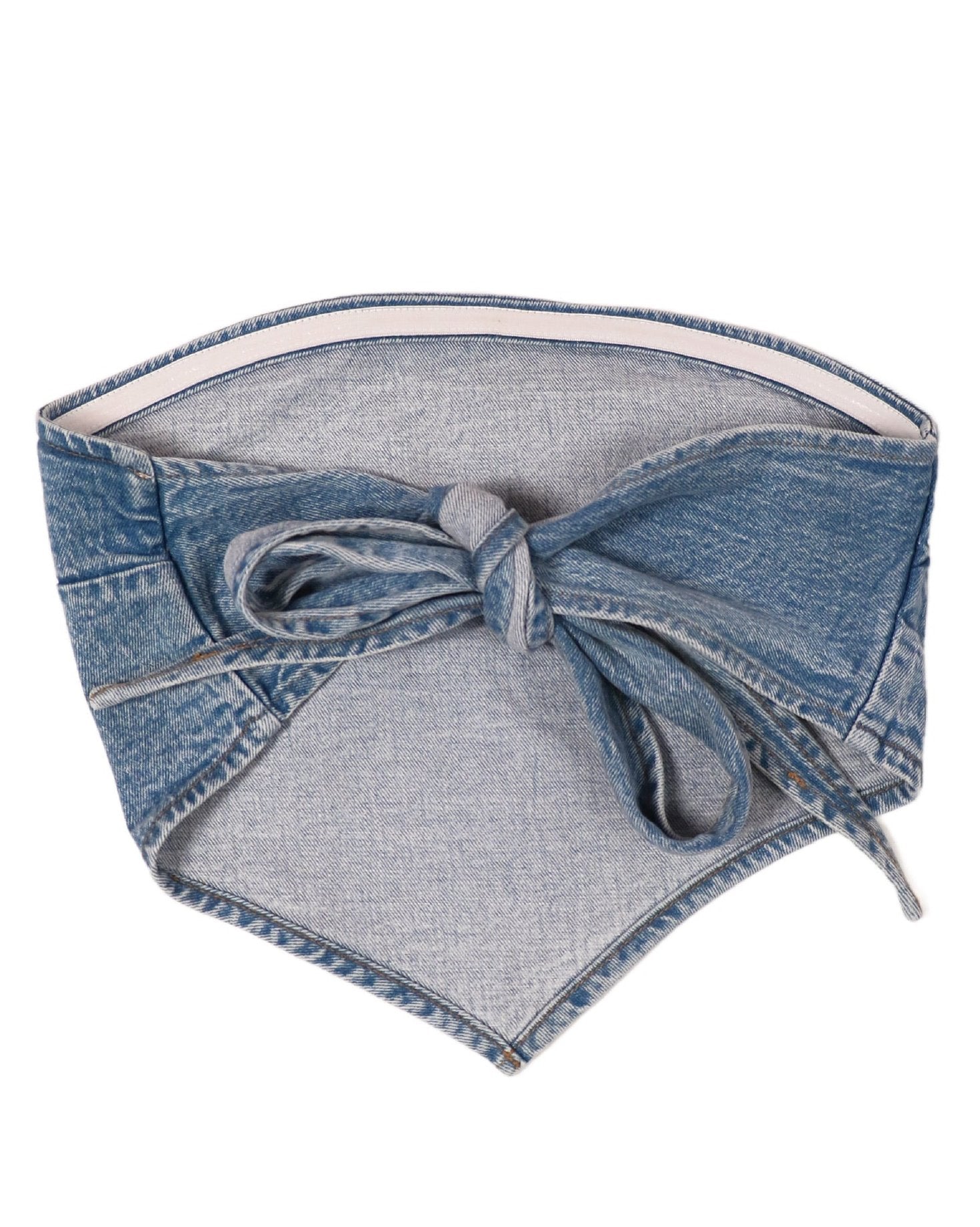 - Design: Bold red Cowboy Pillows print on denim with a tie-back closure for that perfect blend of style and comfort