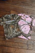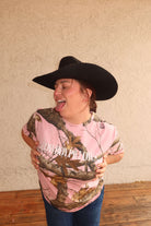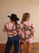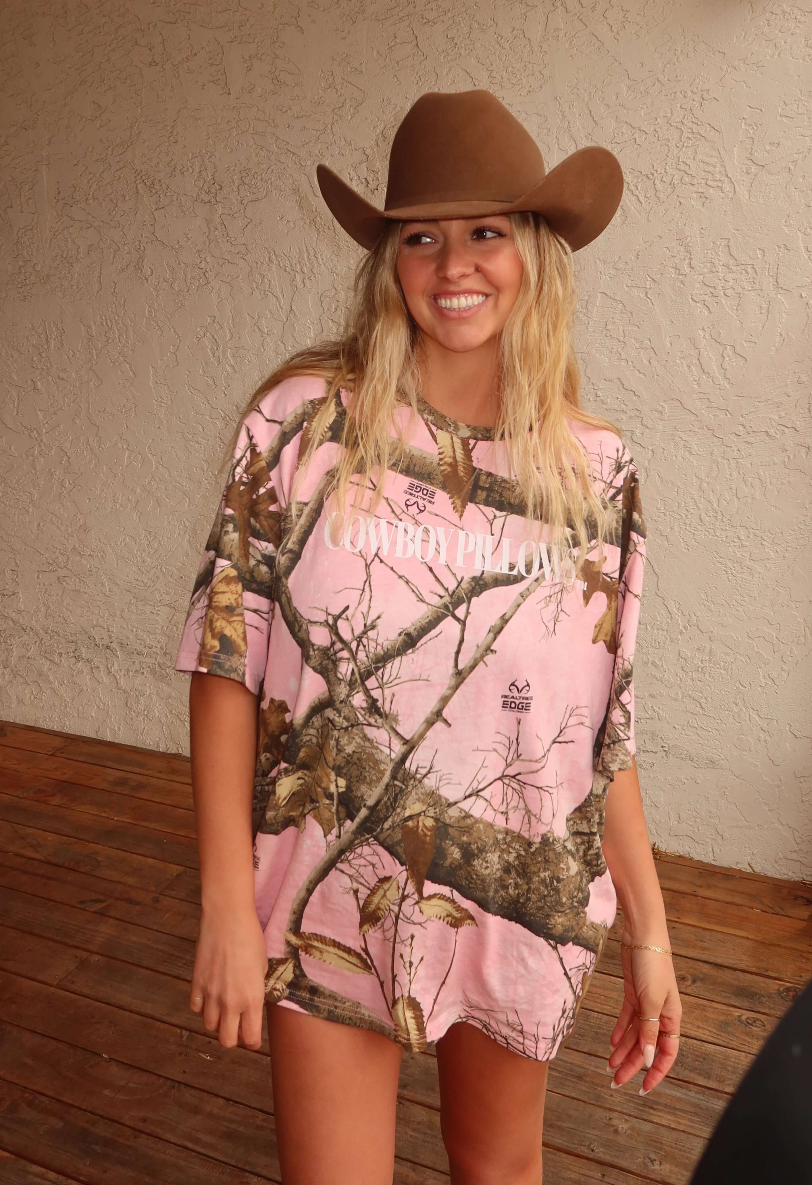 Our PINK Unisex REALTREE Tee is perfect for any cowgirl who wants to show off their bold, fun side. Featuring the trademarked slogan COWBOY PILLOWS™️ screenprinted on the front, this tee is as comfy as it is eye-catching. Gracie Lou sized up to create that oversized, laid-back look that’s perfect for pairing with your favorite cowboy boots—no pants required!